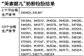 據(jù)介紹,江蘇共封存涉嫌篡標(biāo)“美素麗兒”奶粉9841.3公斤,送檢207批次樣品。檢測(cè)結(jié)果是205個(gè)批次合格,涉及43個(gè)生產(chǎn)批號(hào);2個(gè)批次不合格,涉及2個(gè)生產(chǎn)批號(hào),主要是蛋白質(zhì)含量未達(dá)標(biāo)。